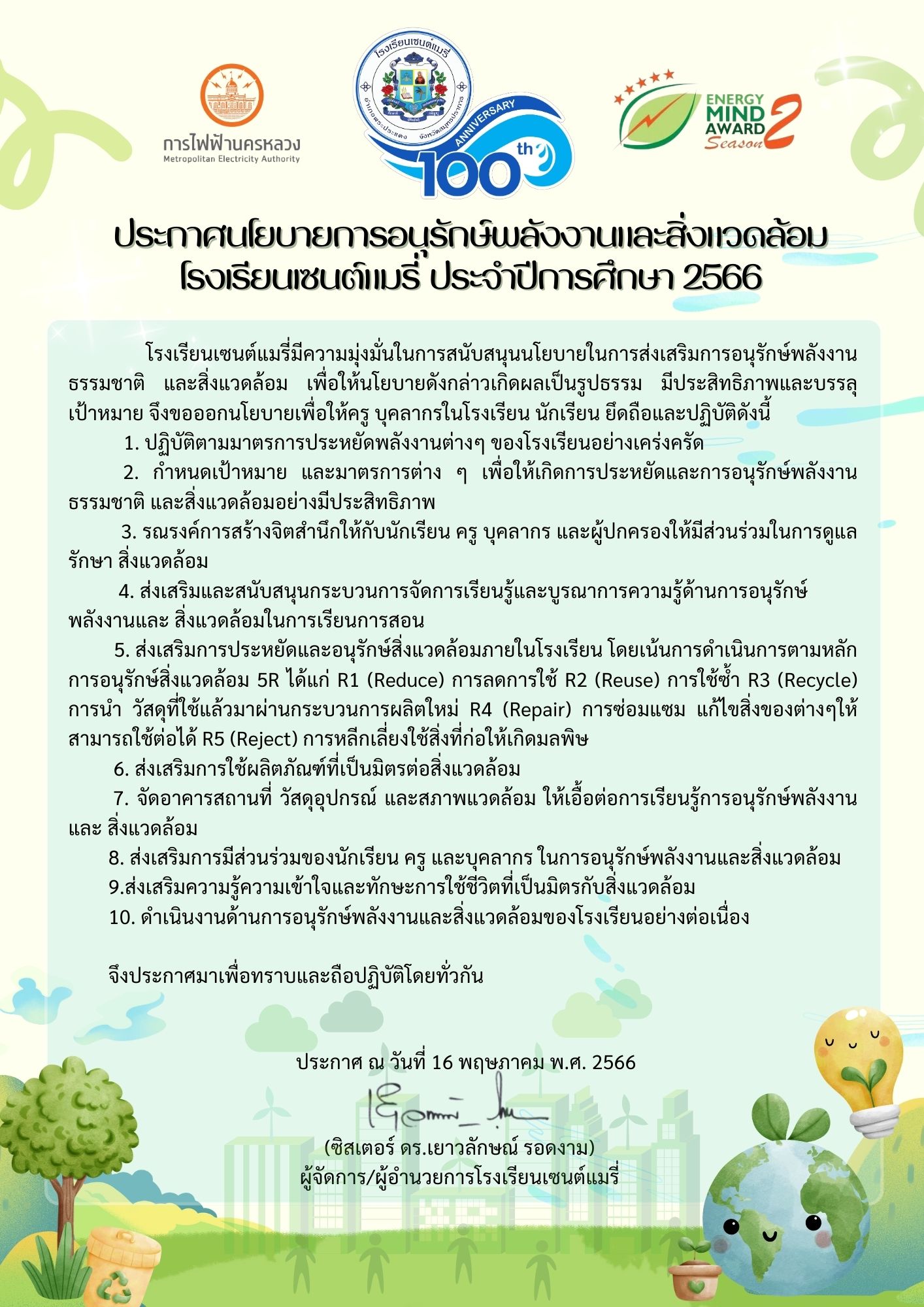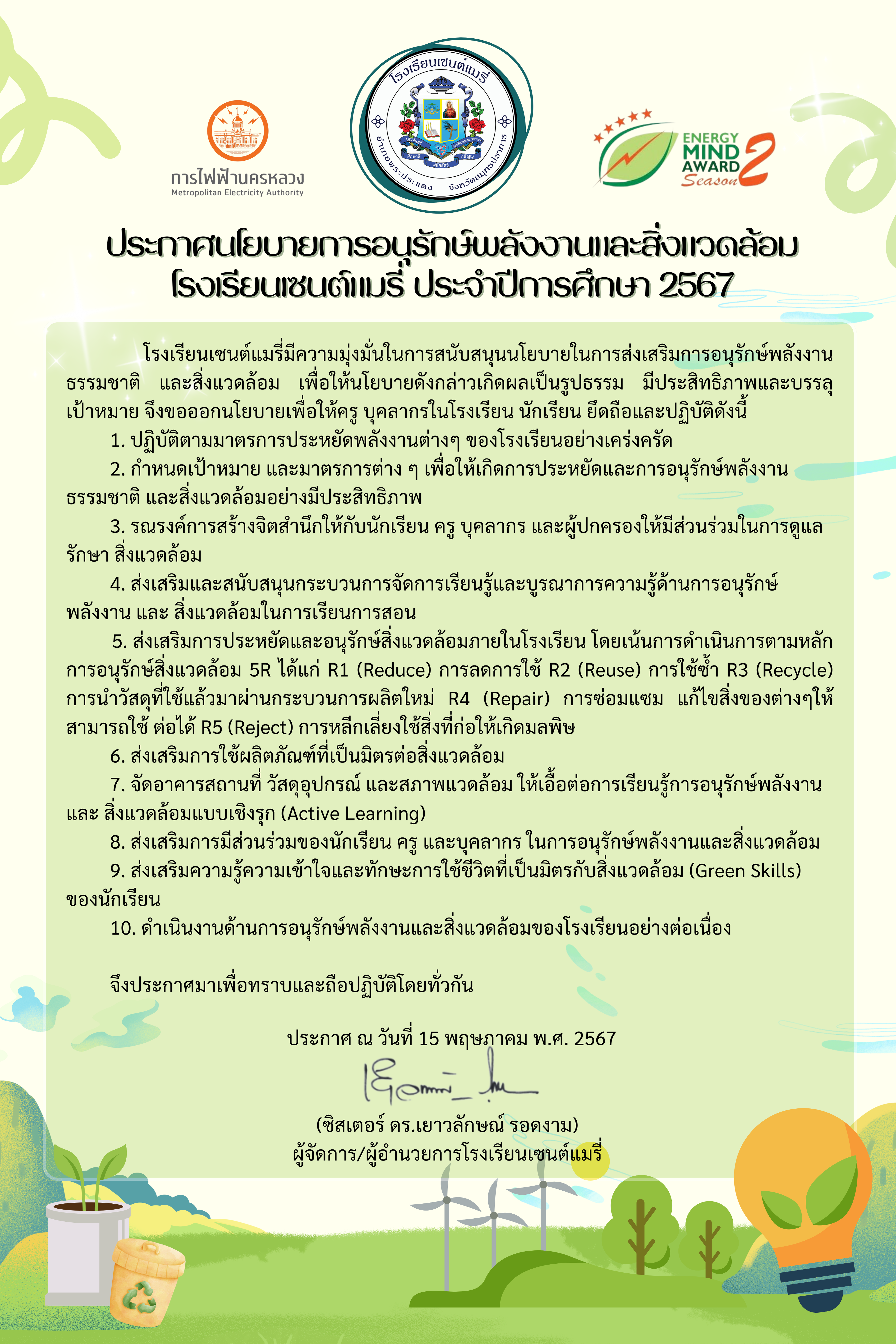 โรงเรียนเซนต์แมรี่ได้รับรางวัล ผลการดำเนินงานยอดเยี่ยม หมวดที่ 5 ความรู้ความเข้าใจและทักษะการใช้ชีวิตที่เป็นมิตรต่อสิ่งแวดล้อมของผู้เรียน และหมวดที่ 6 ความยั่งยืนของการดำเนินงานด้านการอนุรักษ์พลังงานและสิ่งแวดล้อมของโรงเรียน ตามโครงการ Energy Mind Award Season 2 โดยการไฟฟ้านครหลวง