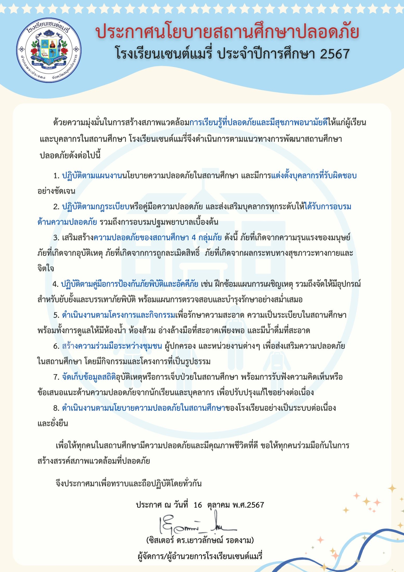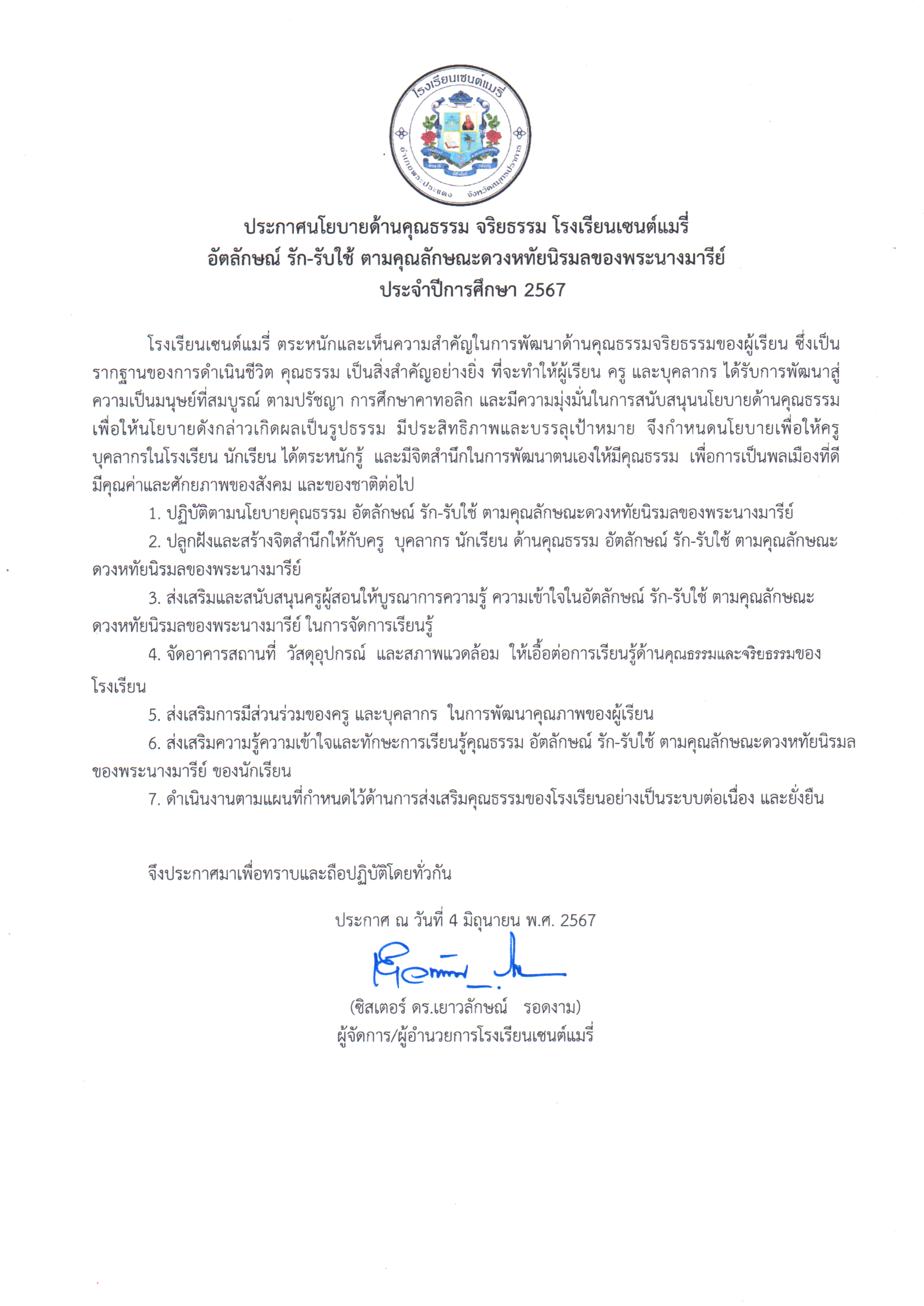 โรงเรียนเซนต์แมรี่ได้รับโล่รางวัลเชิดชูเกียรติ "โรงเรียนต้นแบบปลอดบุหรี่ บุหรึ่ไฟฟ้า กัญชา และเครื่องดื่มแอลกอฮอล์" โดยมูลนิธิรณรงค์เพื่ิอการไม่สูบบุหรี่
