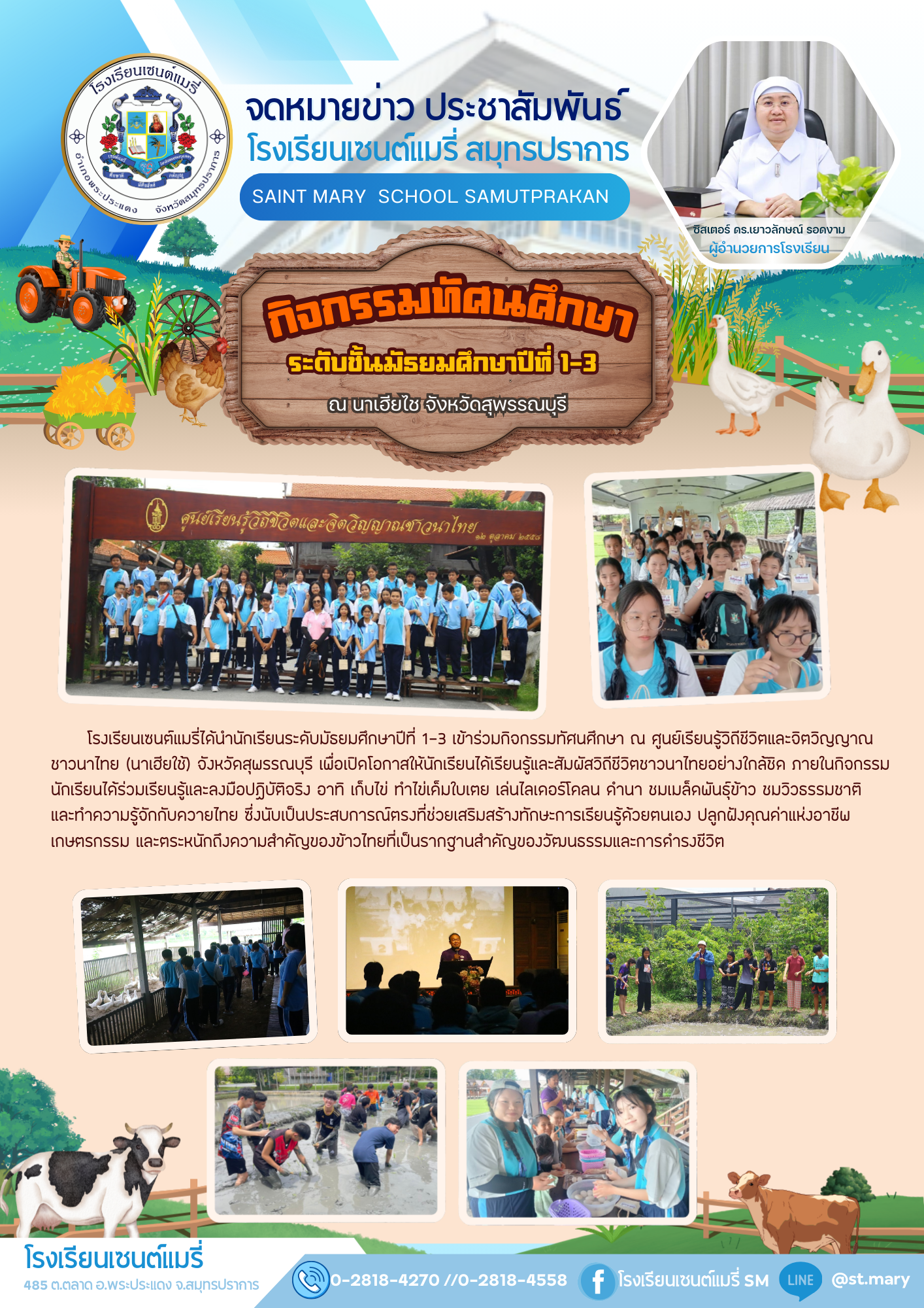 โรงเรียนเซนต์แมรี่ได้นำนักเรียนระดับมัธยมศึกษาปีที่ 1–3 เข้าร่วมกิจกรรมทัศนศึกษา ณ ศูนย์เรียนรู้วิถีชีวิตและจิตวิญญาณชาวนาไทย (นาเฮียใช้) จังหวัดสุพรรณบุรี เพื่อเปิดโอกาสให้นักเรียนได้เรียนรู้และสัมผัสวิถีชีวิตชาวนาไทยอย่างใกล้ชิด ภายในกิจกรรม นักเรียนได้ร่วมเรียนรู้และลงมือปฏิบัติจริง อาทิ เก็บไข่ ทำไข่เค็มใบเตย เล่นไลเดอร์โคลน ดำนา ชมเมล็ดพันธุ์ข้าว ชมวิวธรรมชาติ และทำความรู้จักกับควายไทย ซึ่งนับเป็นประสบการณ์ตรงที่ช่วยเสริมสร้างทักษะการเรียนรู้ด้วยตนเอง ปลูกฝังคุณค่าแห่งอาชีพเกษตรกรรม และตระหนักถึงความสำคัญของข้าวไทยที่เป็นรากฐานสำคัญของวัฒนธรรมและการดำรงชีวิต