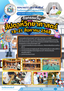 กิจกรรมสัปดาห์วิทยาศาสตร์ วันที่ 18-21 สิงหาคม พ.ศ.2568 ซิสเตอร์ ดร.เยาวลักษณ์ รอดงาม ได้ให้เกียรติเป็นประธานเปิดงานกิจกรรมสัปดาห์วิทยาศาสตร์ กลุ่มสาระวิทยาศาสตร์และเทคโนโลยี ได้จัดกิจกรรมเพื่อส่งเสริมทักษะทางด้านวิทยาศาสตร์ ดังนี้