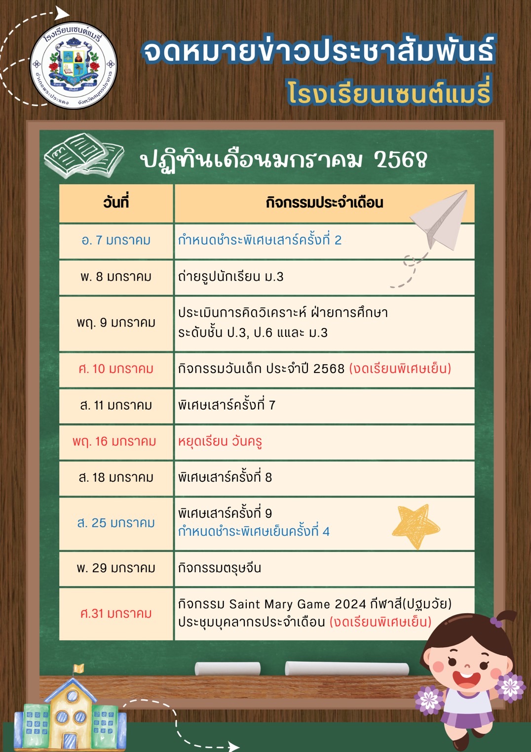 ข่าวประชาสัมพันธ์ ปฏิทินกิจกรรมประจำเดือน มกราคม 2567 โรงเรียนเซนต์แมรี่