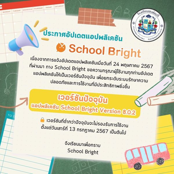 แอปพลิเคชัน School Bright ได้มีการเปิดอัพเดทเวอร์ชั่นใหม่ ขอทุกท่านเข้าไปดำเนินการอัพเดทให้เป็นเวอร์ชั่นปัจจุบัน เพื่อให้สามารถใช้งานระบบได้เป็นอย่างดี